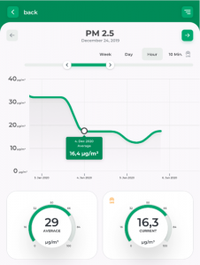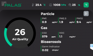 图3:AQ Guard屏幕视图AQ Guard内置的辅助传感器用于CO2和挥发性有机碳水化合物(VOC)提供符合欧洲模型计算室内空气质量指数(AQI)的数据。 AQ Guard还可以记录空气温度,压力和相对湿度。由于CO2是人类呼吸的示踪剂,因此可以结合使用CO2含量和粒度分布的测量值来指示人类所排放的细菌和颗粒对空气的污染。因此,在室内,可以确定存在的人员所呼出的空气中含有潜在感染性颗粒的比例。这种数据评估是评估室内空气质量的一个新维度,可以在AQ Guard中用作“感染风险指标”。与一般空气质量指数(AQI)相比,对人为气溶胶的空气污染评估更为具体和有意义。